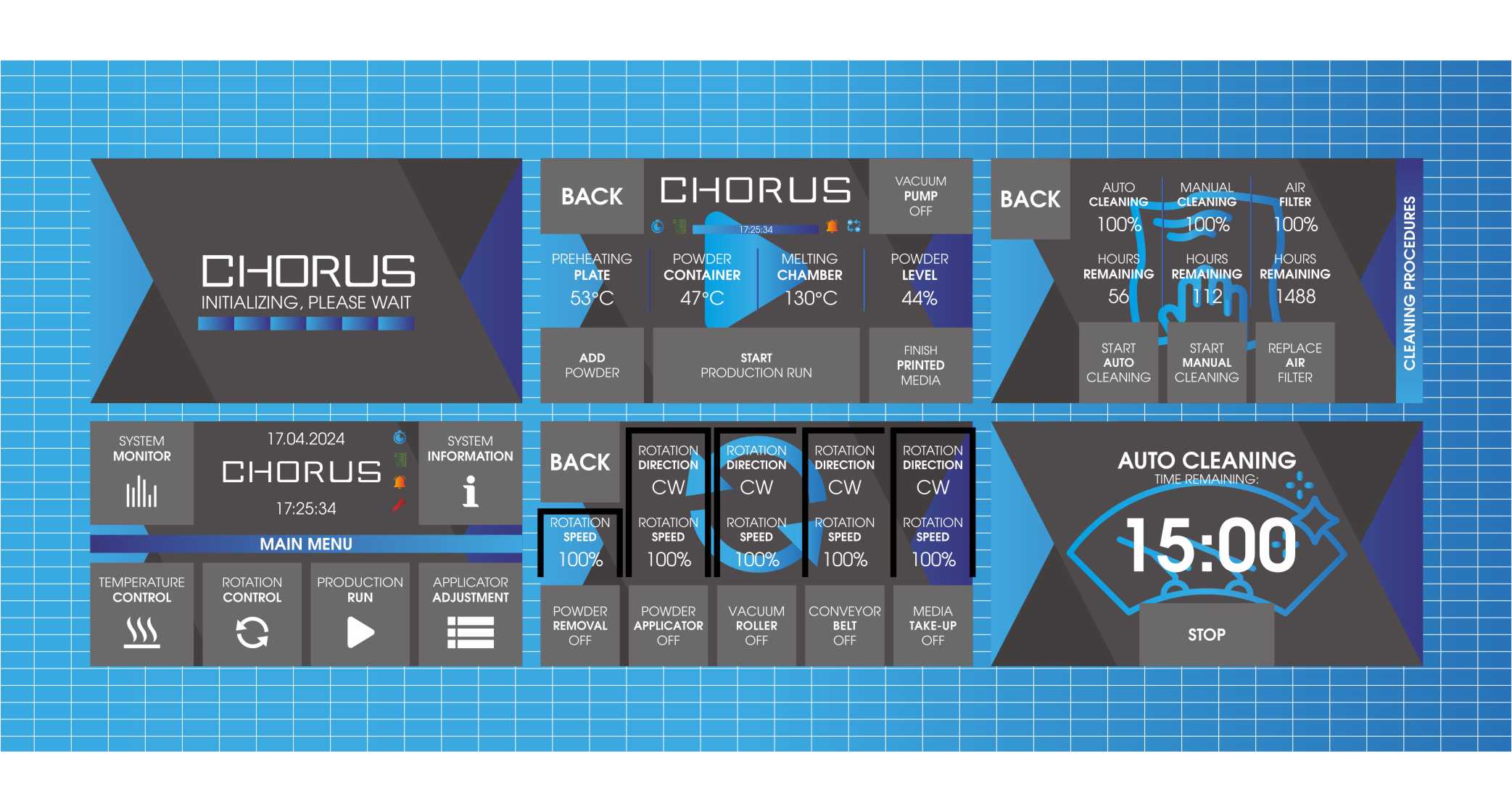 Zusätzliche Funktionen wie zeitgesteuerte Produktionsläufe und die Überwachung der Lebensdauer von Filtern erhöhen die Stabilität und die Arbeitsplanung von Chorus. Lösungen wie die vordere Vakuumwalze ermöglichen einen minimalen Medienverlust während des Aushärtungsprozesses. Die zeitgesteuerte Produktionsläufe und die Überwachung der Lebensdauer von Luftfiltern verbessern die Stabilität und Arbeitsplanung von Chorus weiter. Lösungen wie die vordere Vakuumwalze sorgen für minimale Medienverluste während des Aushärtungsprozesses.